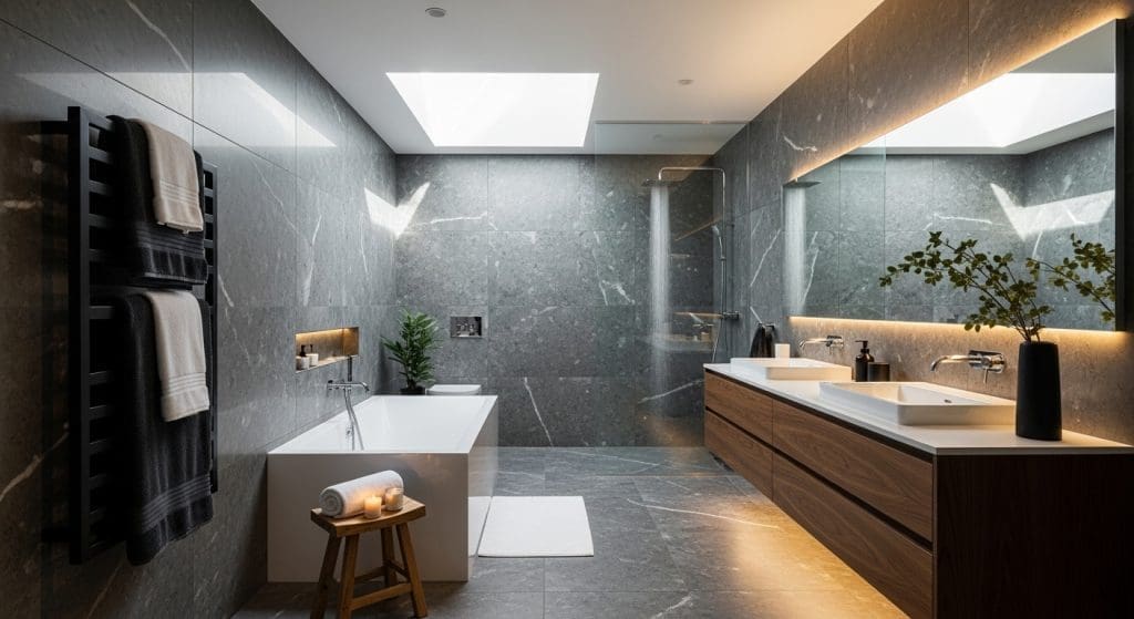 Color psychology plays a big role here. Cool and muted tones reduce mental stimulation, helping your brain shift into rest mode. When paired with natural materials and soft lighting, they make your home spa bathroom feel more cohesive and soothing.