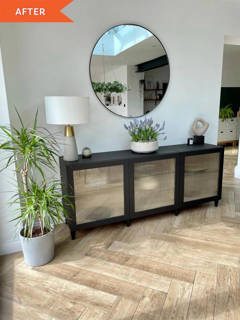 Start with a simple BESTÅ or KALLAX unit and add wooden tapered legs to give the console that iconic mid century silhouette. Then apply walnut veneer or wood contact paper to the cabinet fronts to create a warm vintage inspired finish.
