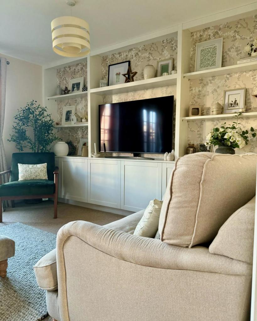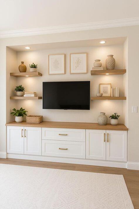 Floating shelves also help balance the visual weight of the TV, making the wall feel more intentionally designed.