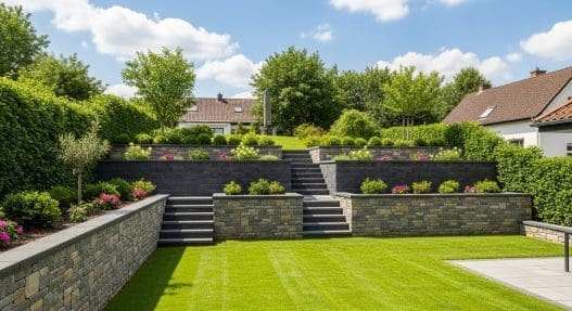 Terraced retaining walls combine hardscape structure with softscape elements like grass, flowers, or shrubs. Each level can be planted differently to add color and variety. We recommend using consistent materials across terraces for cohesion while incorporating diverse plant heights for visual interest.