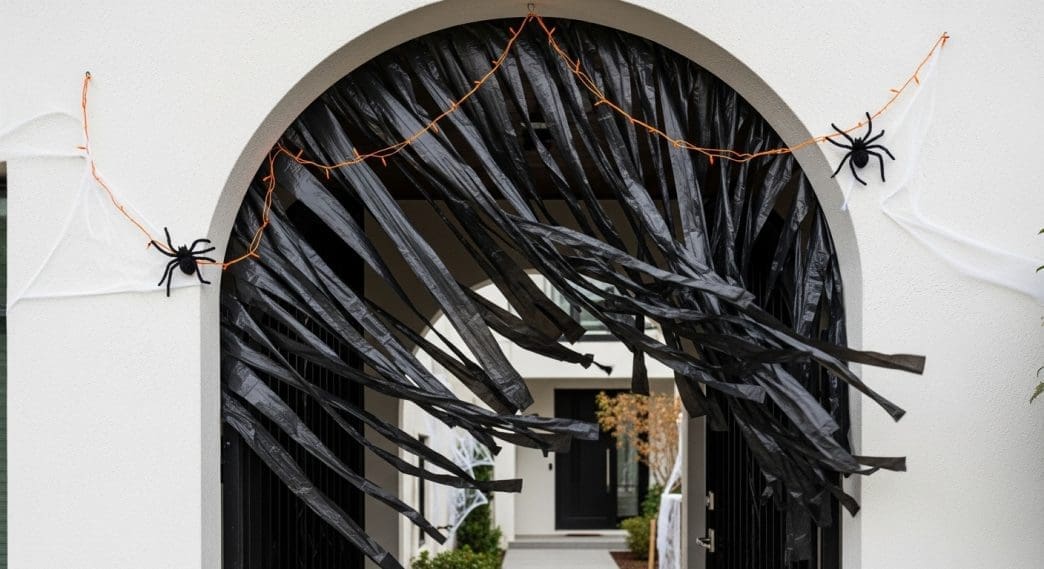 This idea is perfect if you need something dramatic but quick. Cut black trash bags into long strips to create a fluttering curtain that sways as people walk through. The result is a creepy, tattered entryway that looks like it belongs in a haunted house. You can layer in a few strands of orange string lights or plastic spiders to make it more textured. It’s one of the cheapest and easiest Halloween archway ideas out there—great for renters or apartment doors too.