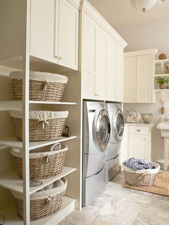 Laundry room ideas that are perfect for organization often include exit pathways for finished tasks.