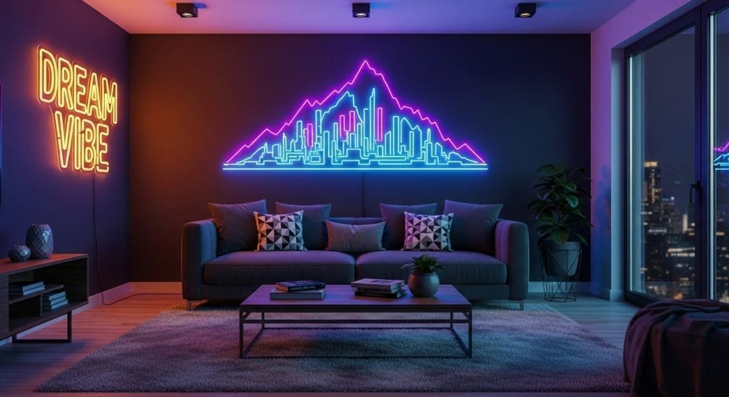 Imagine a neon word glowing above your sofa, like “Chill” or “Dream.”