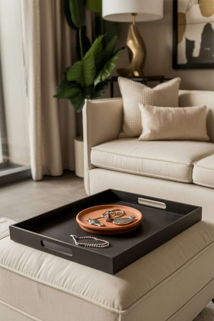 Use a mini terracotta bowl to store jewelry, keys, or loose change. It adds color and function without cluttering your ottoman tray decor.