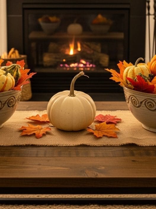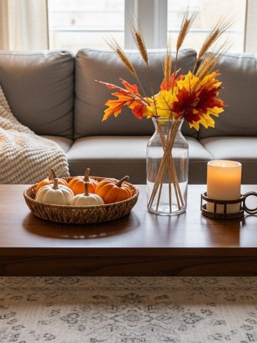I love mixing in woven baskets or burlap-wrapped pumpkins to introduce texture and a handcrafted feel. Scatter pinecones, acorns, or dried wheat around the edges for a touch of nature that looks like it came straight from a countryside stroll. A chunky knit throw casually draped over the side of the table adds softness and invites everyone to get cozy. The rustic style is all about comfort and authenticity, so don’t be afraid to let your coffee table look a little lived-in, layered, and welcoming, just like a warm fall afternoon on the porch.