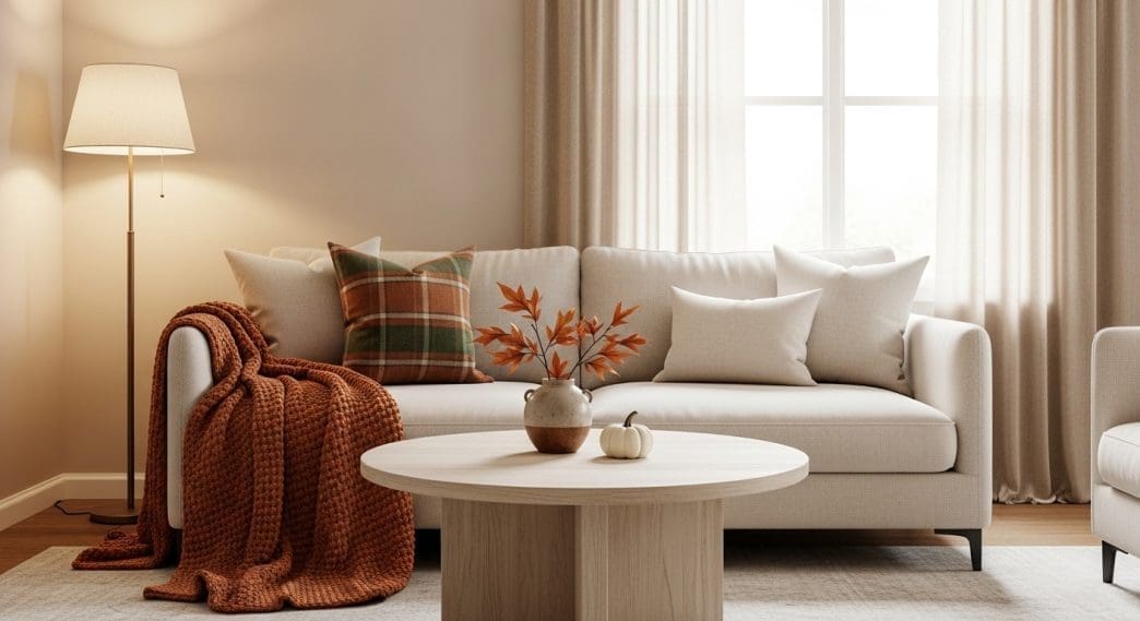 Textiles aren’t just for sofas. I like to drape a chunky knit throw so it casually spills over one side of the coffee table. It softens the hard surface and adds texture that screams “fall.” Go for a warm caramel, deep olive, or creamy beige to match the season’s palette. The throw works like a frame, visually connecting the table to the surrounding furniture. Plus, it’s functional. Guests can grab it during movie night, and it makes the whole space feel lived-in.