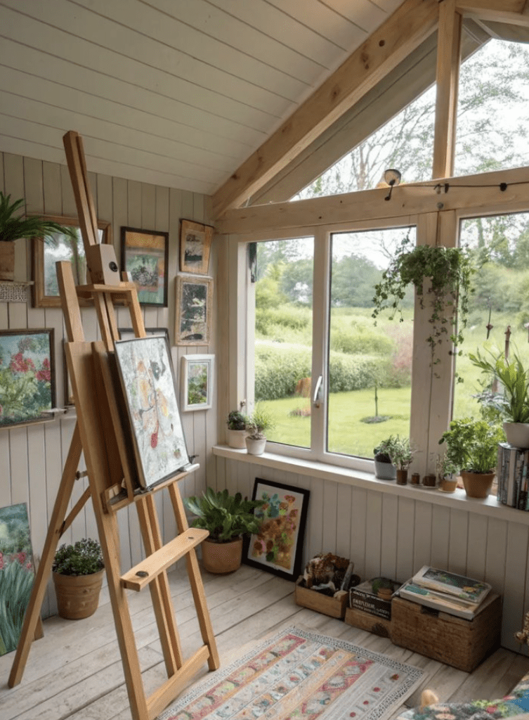 If you paint, draw, or work with clay, a she shed can be your dream studio. Consider adding a skylight panel or translucent roof section to bring in natural light. Use drop cloths, vintage easels, and metal shelving to organize your materials.