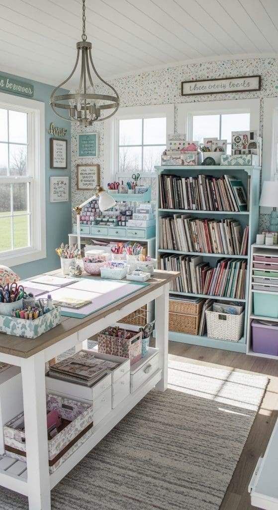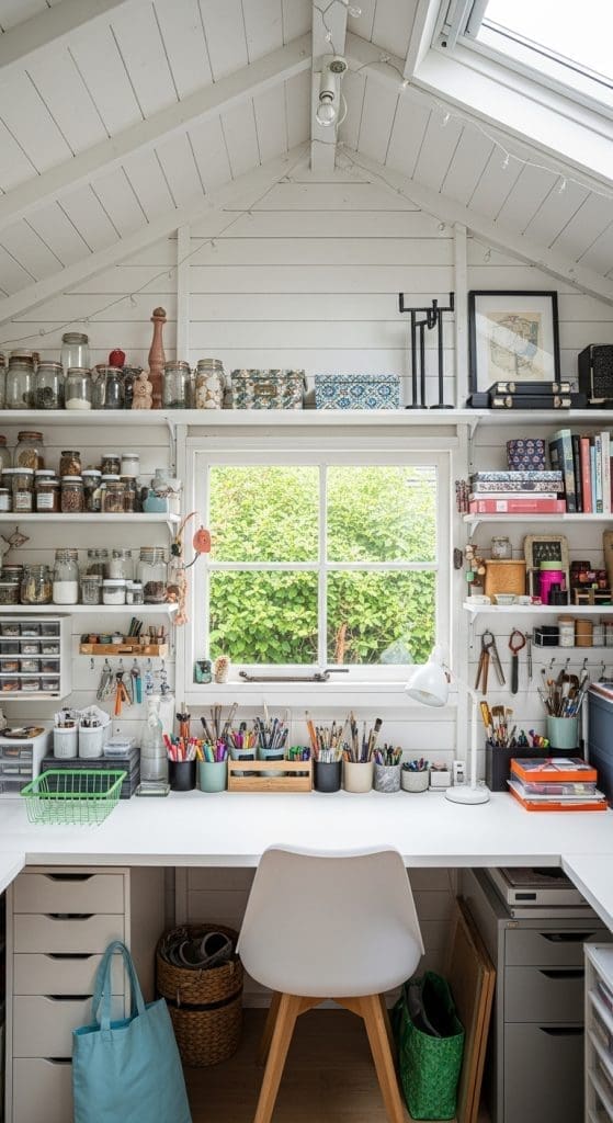 For a creative She Shed install open shelving to display your supplies in jars, baskets, or labeled containers. Think rainbow-colored-coded threads, washi tape rows, and neatly stacked sketch pads. This visual access not only looks beautiful, but helps your creative brain stay uncluttered. A central desk or table with great lighting will make your she shed the perfect creative studio.