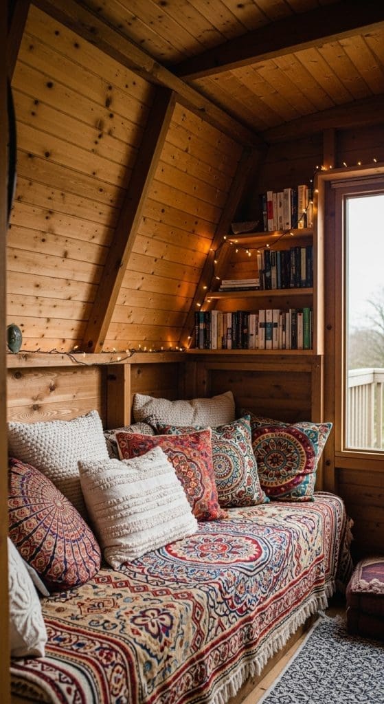 Turning your she shed into a reading retreat doesn’t take much. Start with a large, colourful rug, add a few oversized floor cushions or a small daybed, and hang lightweight curtains to soften the light. You can use string lights and hanging plants for a relaxed, Bohemian vibe.