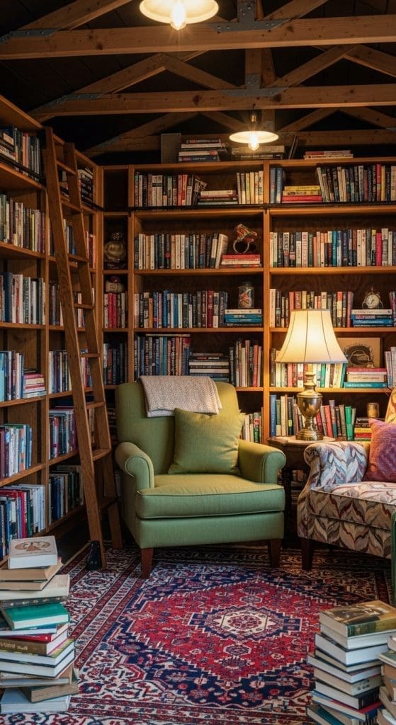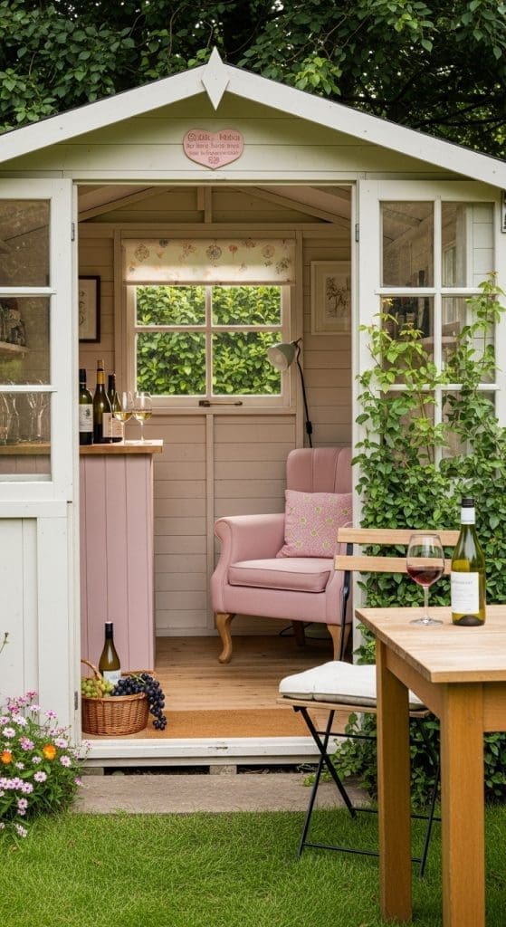 Love the idea of a private library? You can absolutely build one! Install ladder-style shelving units or floating bookshelves from floor to ceiling. Organize by color, genre, or mood. Add a wingback chair or a chaise lounge with layered throw blankets. She shed libraries don’t need to be massive, just cozy and personal.