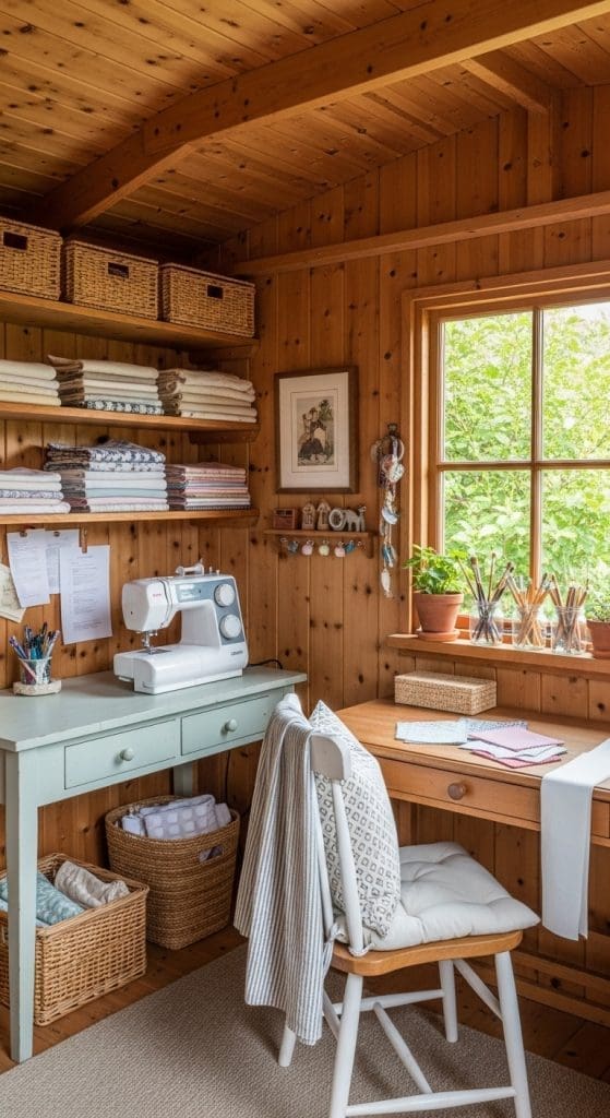 If you are tired of being distracted when sewing at the kitchen table then a quiet sewing space in a she shed could be for you! Use a fold-down sewing table, organized thread racks, and labeled fabric bins. Add a pegboard or curtain rod to hang scissors and supplies within reach.