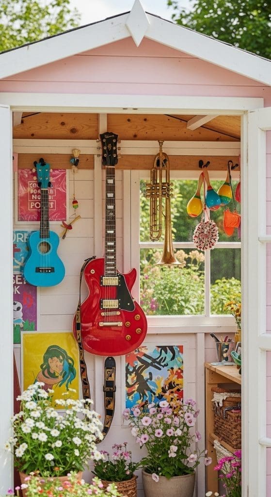 Add soundproofing panels, a music stand, a stool, and maybe even a record player. Whether you’re practicing violin or writing songs, having a personal studio gives you privacy and focus. This idea blends utility and artistry while still keeping the cozy feel of a she shed.
