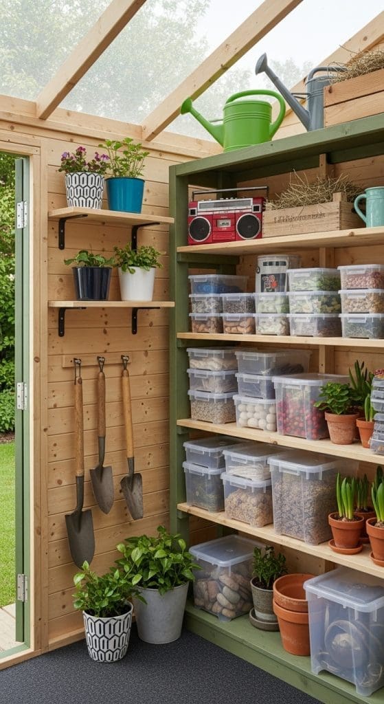 Love getting your hands in the dirt? Turn your shed into a gardener’s dream spot. Install a vintage potting bench along one wall and add pegboards or open shelves for hanging tools, storing plant pots etc. Terracotta pots stacked on shelves, small bins for seed packets, and a sink or water access (if possible) can elevate your setup.
