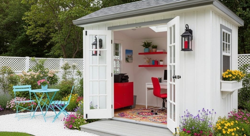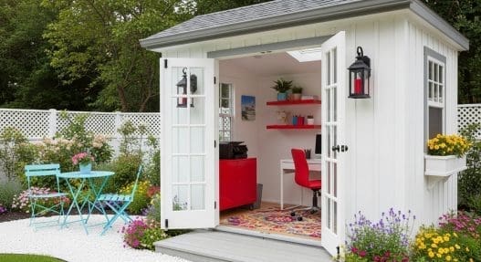 A shed office with insulation, Wi-Fi boosters, a comfy desk chair, and wall-mounted storage can keep your freelance game strong. Paint the walls a color that energizes you—like warm coral or calming blue. When you close the door, you’re “at work.” And when you step outside, you’re home again. This setup supports mental boundaries, productivity, and daily balance.