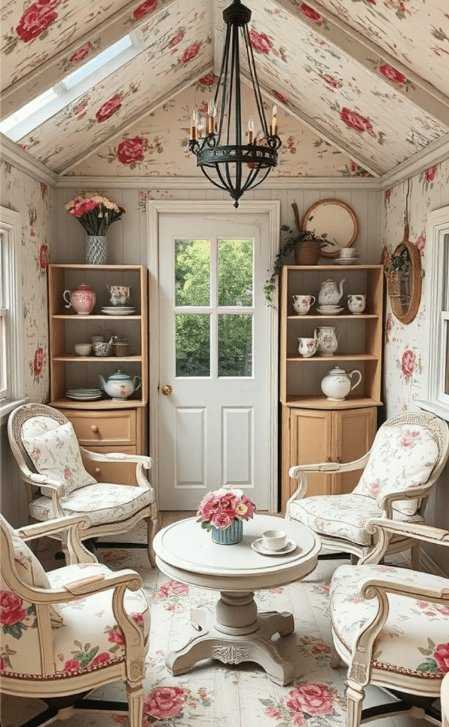 It’s easier to start with a small table in the center of the shed. Next build up the decor by placing mismatched vintage chairs, lace tablecloths, and delicate tea sets. You can continue, depending on your own preferences, you can hang floral wallpaper or even use peel-and-stick patterns for an easy upgrade. Add sconces, a mirror, and fresh flowers to complete the romantic look. The beauty of this style is that it feels timeless and cozy.