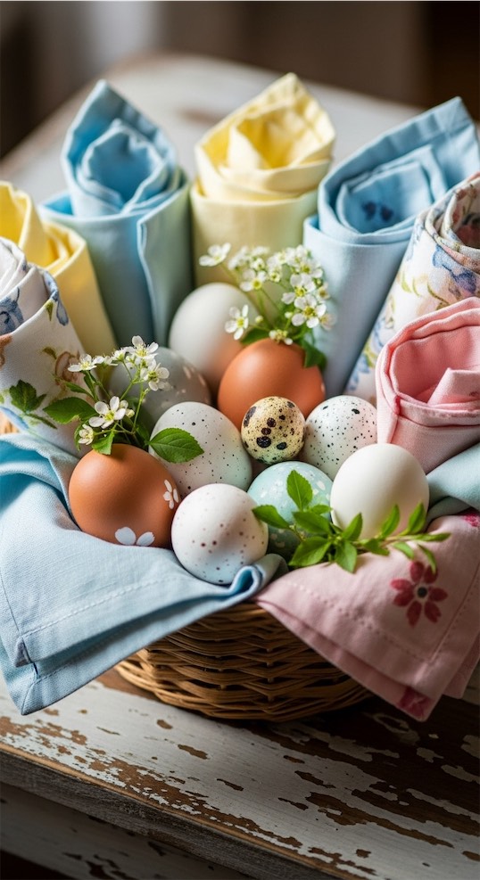 Small baskets make lovely centerpieces when filled thoughtfully. Tuck in folded fabric napkins and a few decorative eggs for a layered, useful display.