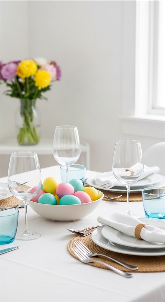 Keep the table mostly neutral and add one pastel accent in the center. This could be a pink vase, blue eggs, or a soft green runner.