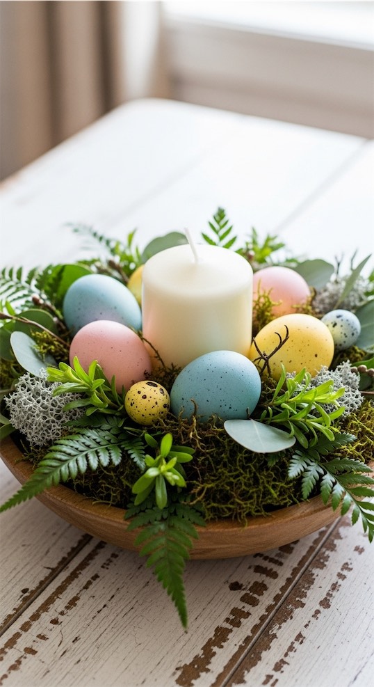 One of my favorite simple Easter centerpiece ideas is simply gathering what is already around the house. A bowl, some greenery, a candle, and a few eggs can come together beautifully.