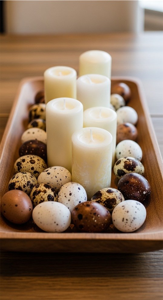A low tray keeps everything grounded. Arrange speckled eggs and a few small candles in a loose cluster.