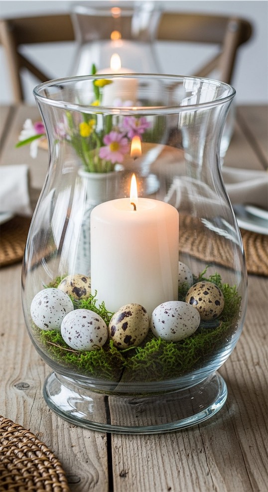 Place a pillar candle inside and surround it with faux eggs or moss at the base.
