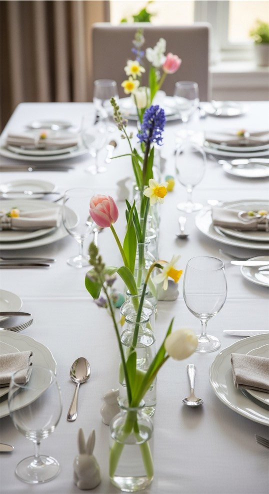 A soft linen or cotton runner instantly warms up the table. Add one small accent in the center, like a bunny figurine or a bowl of eggs, and stop there.