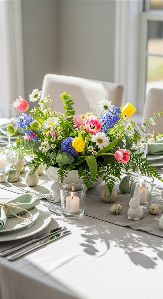 This approach works well for simple Easter centerpiece ideas because you can use whatever flowers are available, tulips, daisies, or even greenery clipped from the yard.