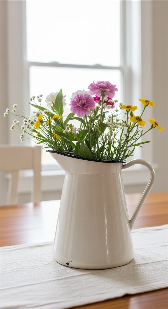 If you have a ceramic or enamel pitcher, it makes a charming Easter vase. Fill it with flowers or greenery and place it slightly off center for a relaxed look.