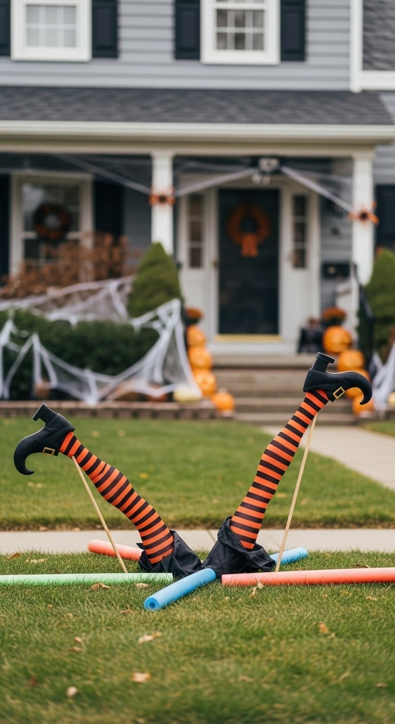 We recommend sticking pool noodles or wooden dowels into the ground with striped tights and pointed shoes to mimic a witch crash-landing. This humorous setup works because it’s unexpected and easy to assemble. It adds depth to your yard display without relying on electricity or large props. The whimsical nature keeps things light and fun.