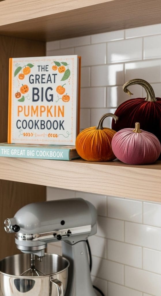 In small kitchens, cookbook stands take up valuable counter space, so instead, lean one or two Halloween-themed cookbooks vertically on a shelf or open ledge. If you don’t have room for books, prop up a themed recipe card in a magnetic clip on the fridge or pinboard. It adds just enough visual interest and gives you a fun seasonal nudge when you’re baking.