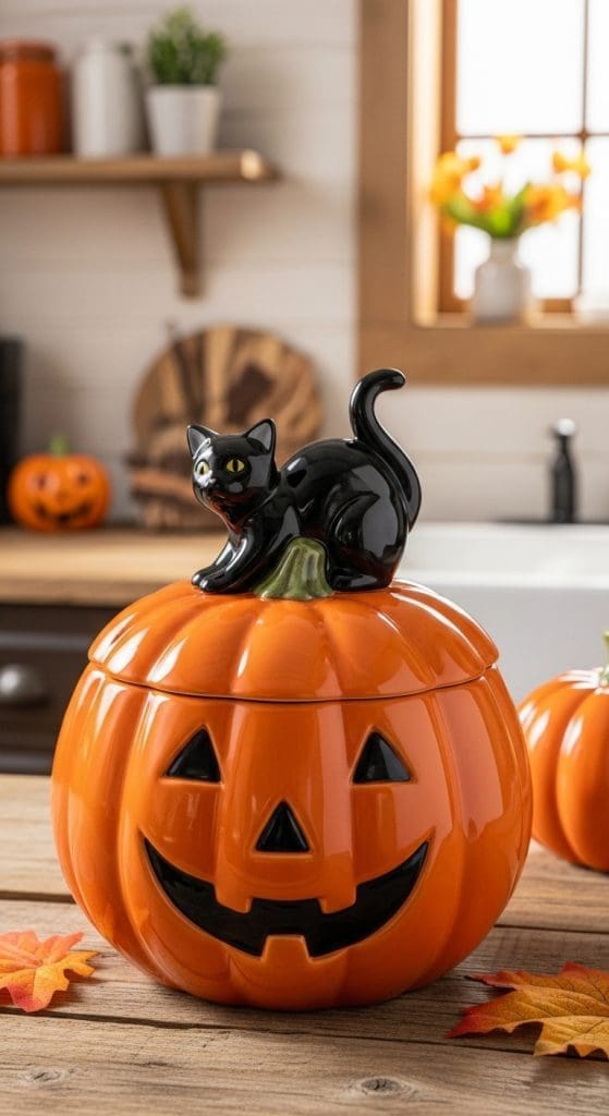 Traditional cookie jars might feel too bulky in a small kitchen, but if you’re strategic, they can serve as both storage and decor. Pick a medium-sized Halloween jar and use it to stash wrapped snacks, tea bags, or even kitchen odds and ends. Instead of bringing in something that takes up precious space, use it to replace an existing container. A jack-o-lantern or black cat-shaped jar can become the visual centerpiece of your counter, adding Halloween vibes without adding clutter.