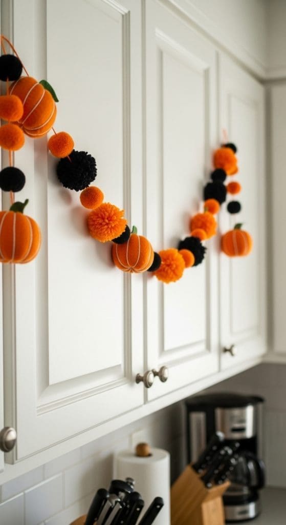 Garlands can feel overwhelming in tight spaces, but when draped strategically across the top of cabinets, they add cozy charm without clutter. Look for lightweight styles made of felt or fabric so they’re easy to attach with removable hooks. In a small kitchen, your cabinet tops are often one of the few open areas available – use them! This kind of vertical decorating keeps everything off your counters but still brings in festive texture and movement.