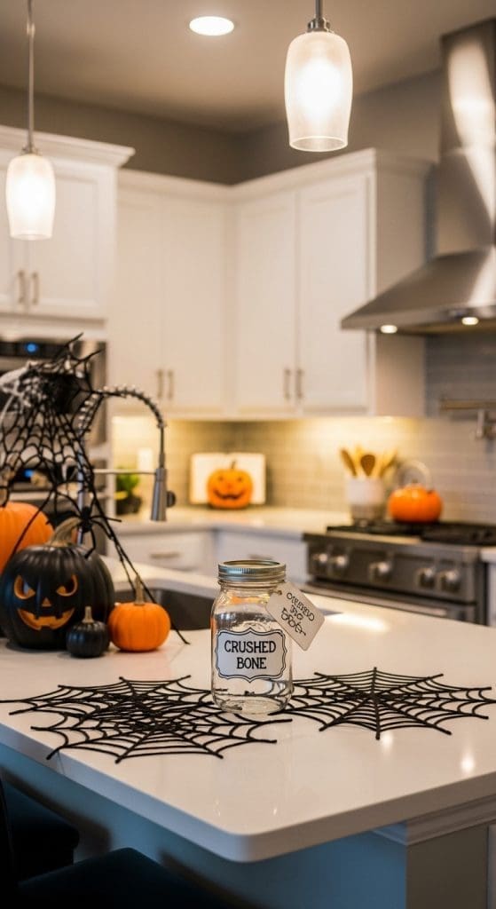 In a small kitchen, you may not have room for big decorative displays, but your cabinets and shelves still offer plenty of styling potential. Draping lightweight spiderweb lace over cabinet tops or open shelves gives a spooky, gothic effect without adding bulk or using up any counter space. It creates texture and drama vertically, pulling the eye upward and away from tight surfaces. You can secure it with removable tape so it’s easy to take down, and it won’t interfere with your daily kitchen routine.