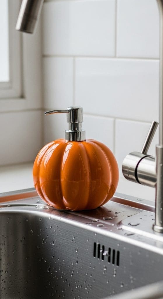 If your sink already has a soap dispenser on display, switching it out for a Halloween-themed one is a zero-space update that still makes a statement. Whether it’s a pumpkin-shaped bottle or a simple amber glass jar with a spooky label, this micro change adds charm without needing any new surfaces. Bonus points if you choose a seasonal scent like cinnamon or caramel apple, which brings in another layer of Halloween spirit.