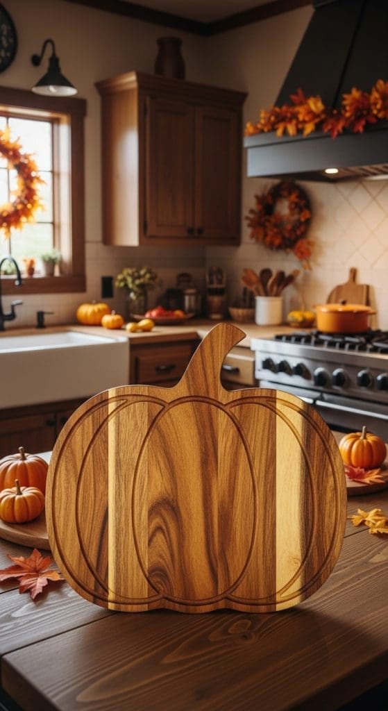 Cutting boards often lean against the backsplash in small kitchens because they’re too bulky for drawers or cabinets. Instead of seeing them as clutter, turn them into decor by choosing a Halloween-themed one. A pumpkin-shaped wooden board or one engraved with bats can stay on display while still being totally functional. It brings texture and visual interest to your limited counter area without adding more objects. In a compact kitchen, functional decor is the name of the game, and this is a great way to use the vertical surface space you’re already relying on.