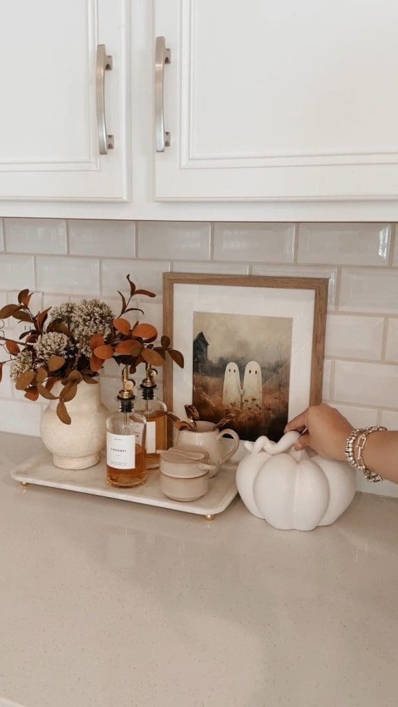 Small framed art is perfect for adding to small kitchens! They don’t overwhelm the space and can be placed behind trays or even hung on the side of your cabinets. Pick art that matches the tones of your kitchen – neutrals, whites, blacks, etc This can help it blend in with the space instead of overwhelming a space. This means you still get to add those cozy Halloween prints, but you haven’t sacrificed any surface or visual space.