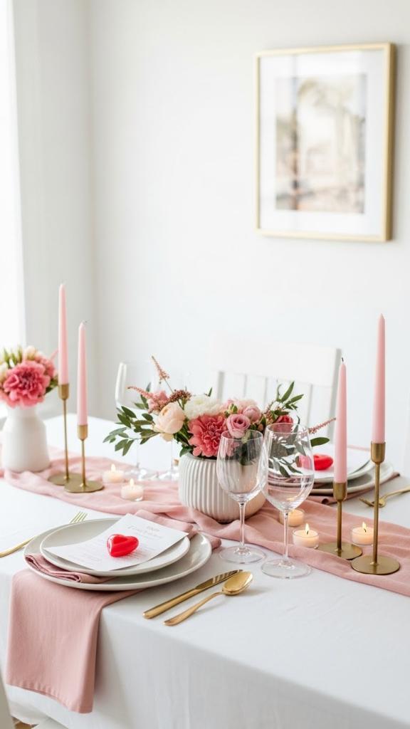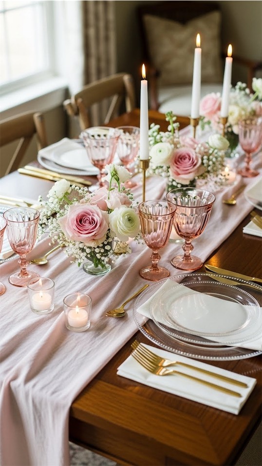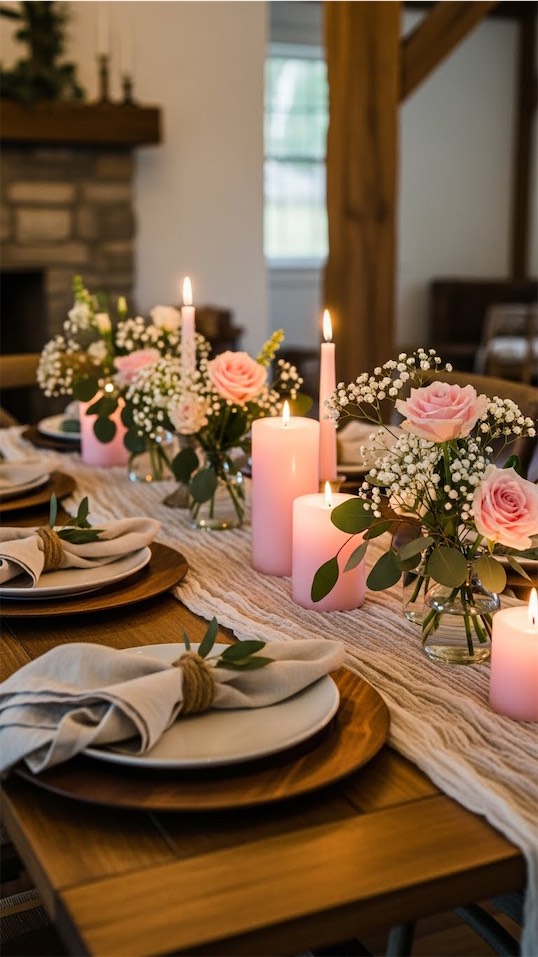 Combine rustic elements like wood chargers or linen napkins with soft pink candles and simple florals.
