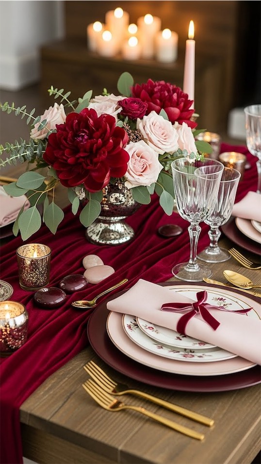 Pairing burgundy with blush creates depth while staying soft.