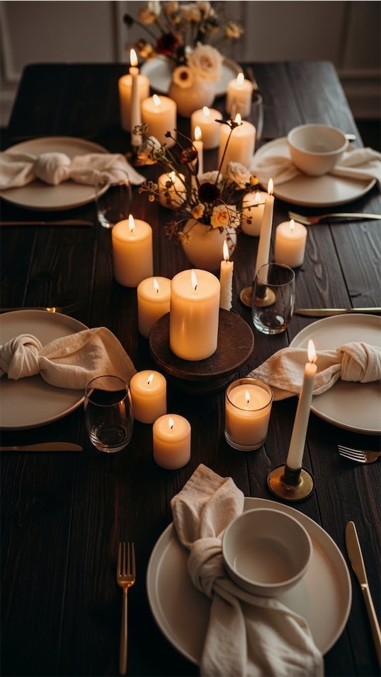 Add cream plates, soft napkins, and plenty of candles for contrast.