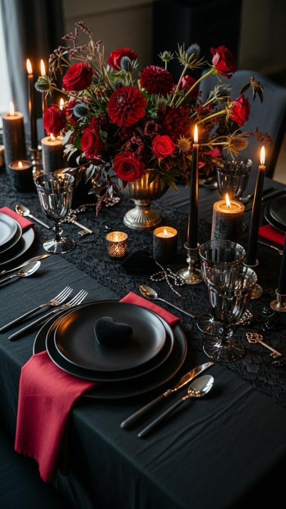 Start with a black tablecloth or runner and layer in deep reds, burgundy florals, and dark candles.