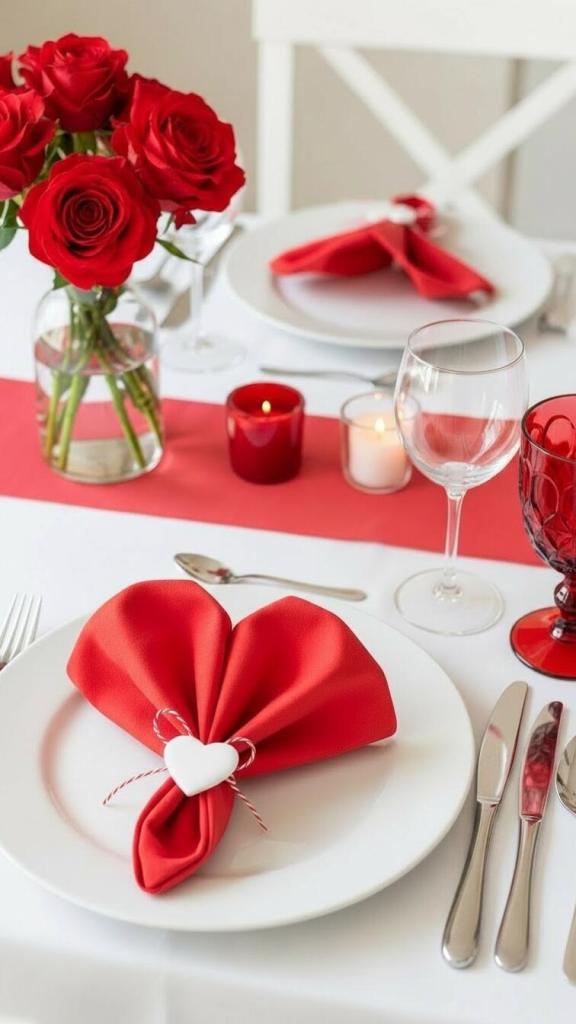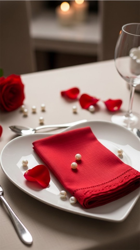 Use them sparingly, like a subtle heart shaped napkin fold or a small heart charm tied to cutlery.