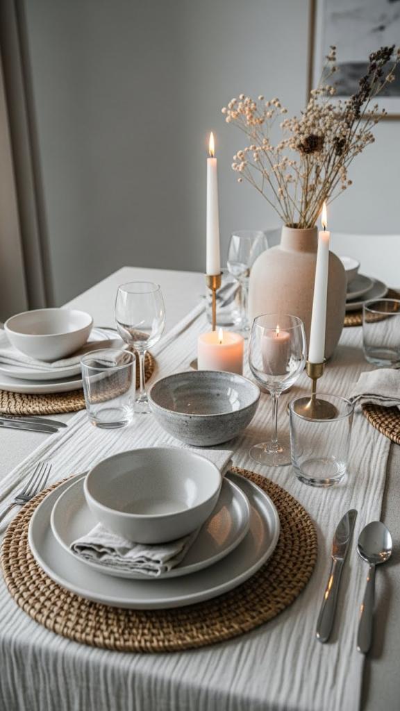 Keeping everything in creams, beiges, and soft grays makes the table feel calm and intimate.